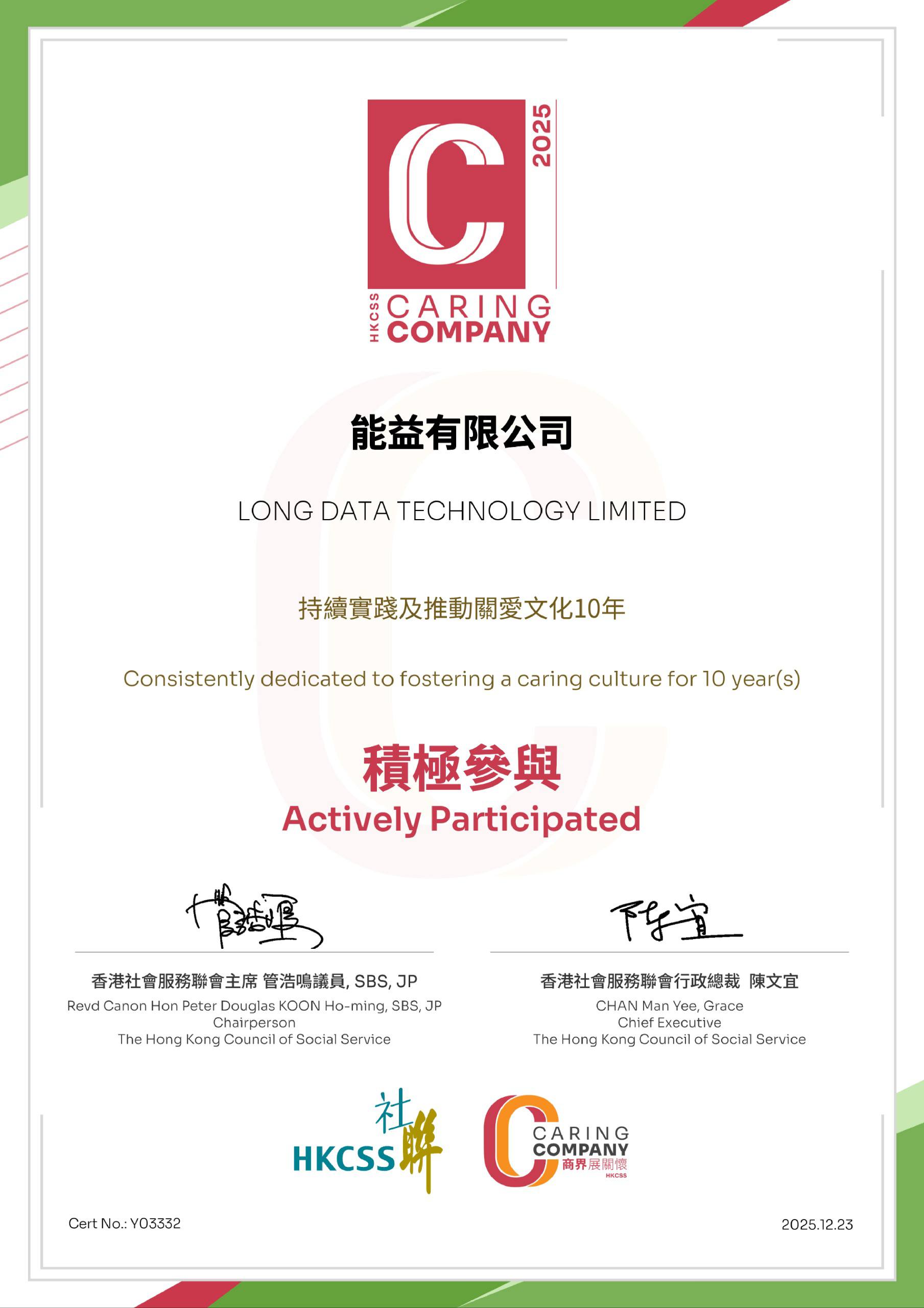 憑藉長期而穩定的實踐成果,能益有限公司榮獲「商界展關懷」計劃頒發的「持續實踐及推動關愛文化10年認証」,充分肯定公司在企業社會責任領域的堅持與貢獻。